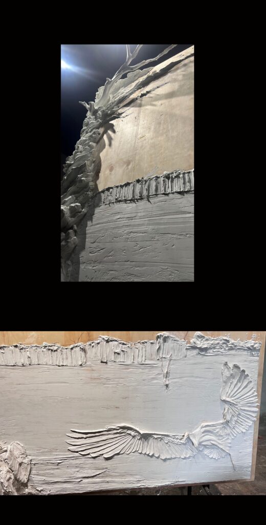 In this particular piece, shown below, we met with an admirable doctor who sought to convey the elegance and nobility of his practice, the tranquility of his dental office where, from the first moment, the patient feels welcomed and alleviates any anxiety that might arise from simply visiting the dentist. We focused entirely on the color white to convey this and unify it with the white we all seek in healthy teeth. Within the design, the sense of calm comes not only from the animals, herons, and the space they inhabit, but also from the doctor’s own personality, which is strongly projected in the sculpture.
